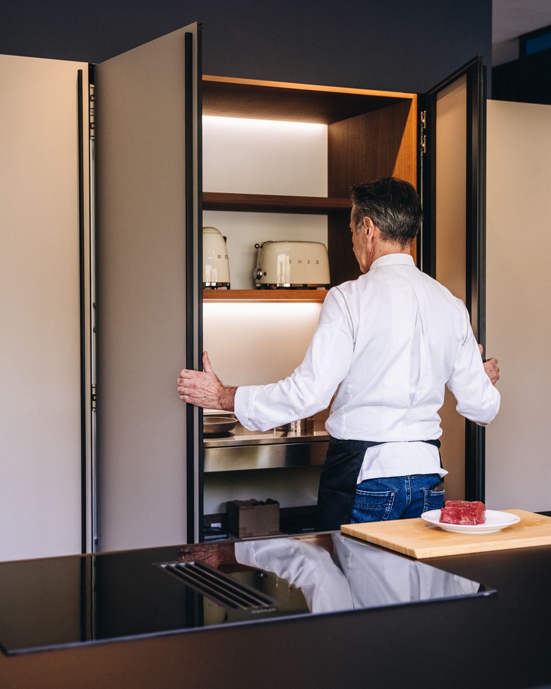 Il top e i fianchi dell’isola in ceramica Lamina effetto travertino, spessi 1,2 cm, aggiungono un tocco di eleganza, mentre lo schienale retroilluminato con barra porta accessori aumenta la funzionalità. Gli elettrodomestici AEG, inclusi il piano cottura con cappa integrata in vetro opaco, garantiscono performance eccellenti.
