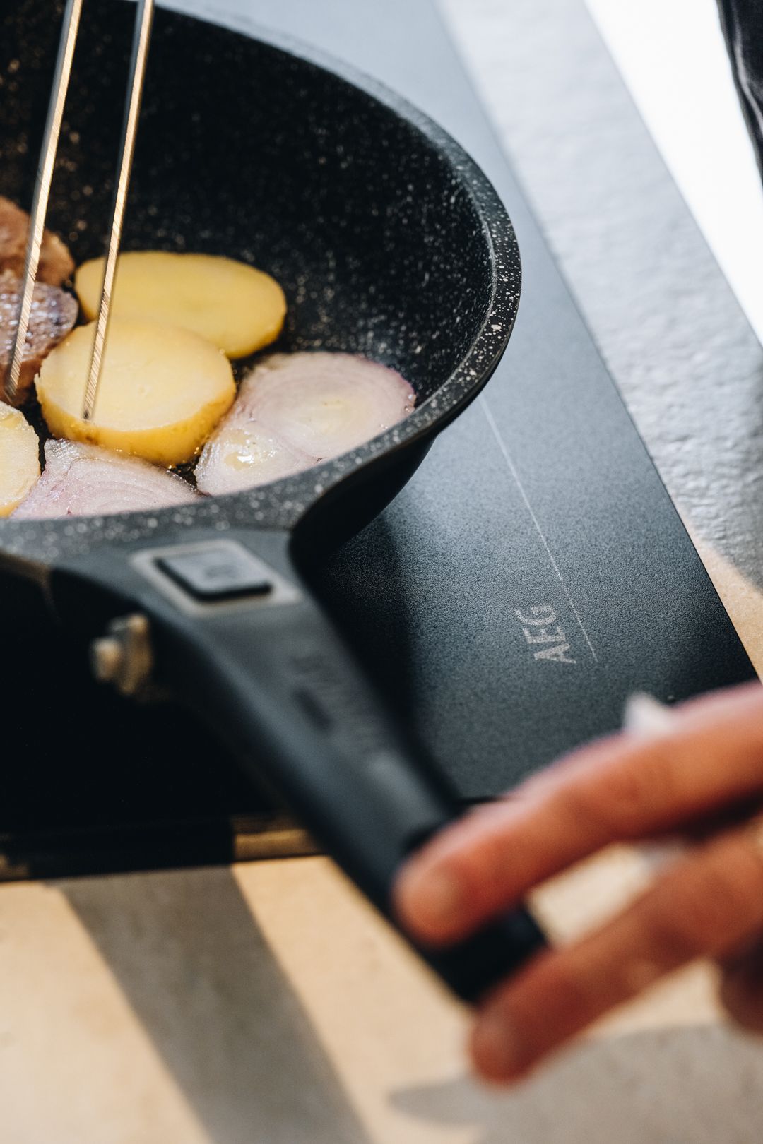 Il tavolo snack tondo, con gamba in metallo, completa l’isola in modo funzionale e accogliente. Gli elettrodomestici AEG, inclusi il piano cottura con cappa integrata, assicurano performance di alto livello.